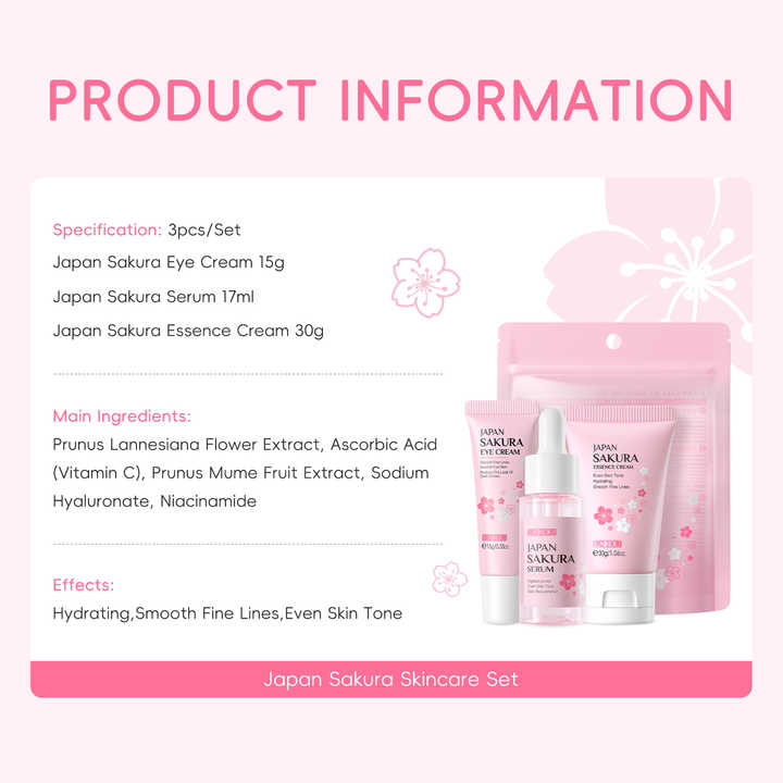 The Laikou Sakura Skincare Set is the ultimate trio you need for glowing skin! This 3-piece set combines the nourishing power of cherry blossoms with carefully selected ingredients to give your skin the rejuvenation it deserves.